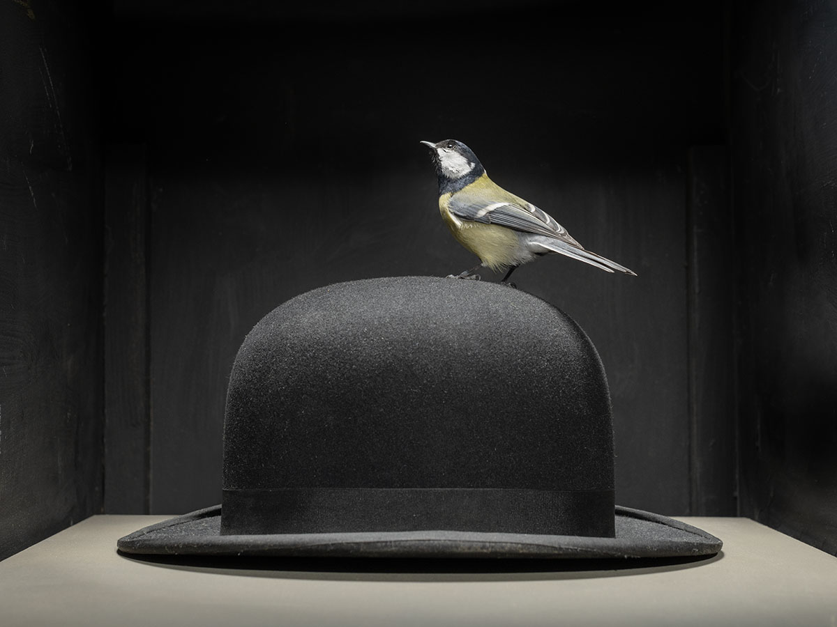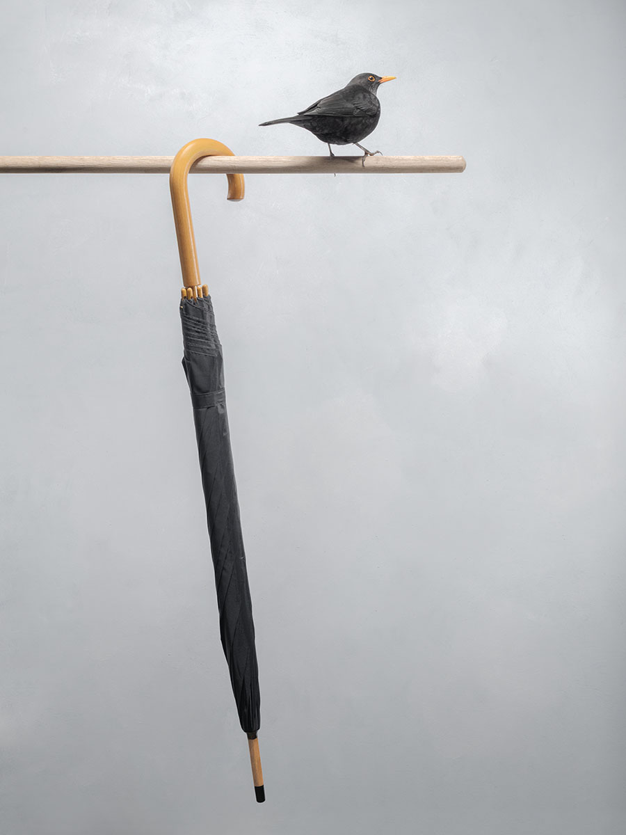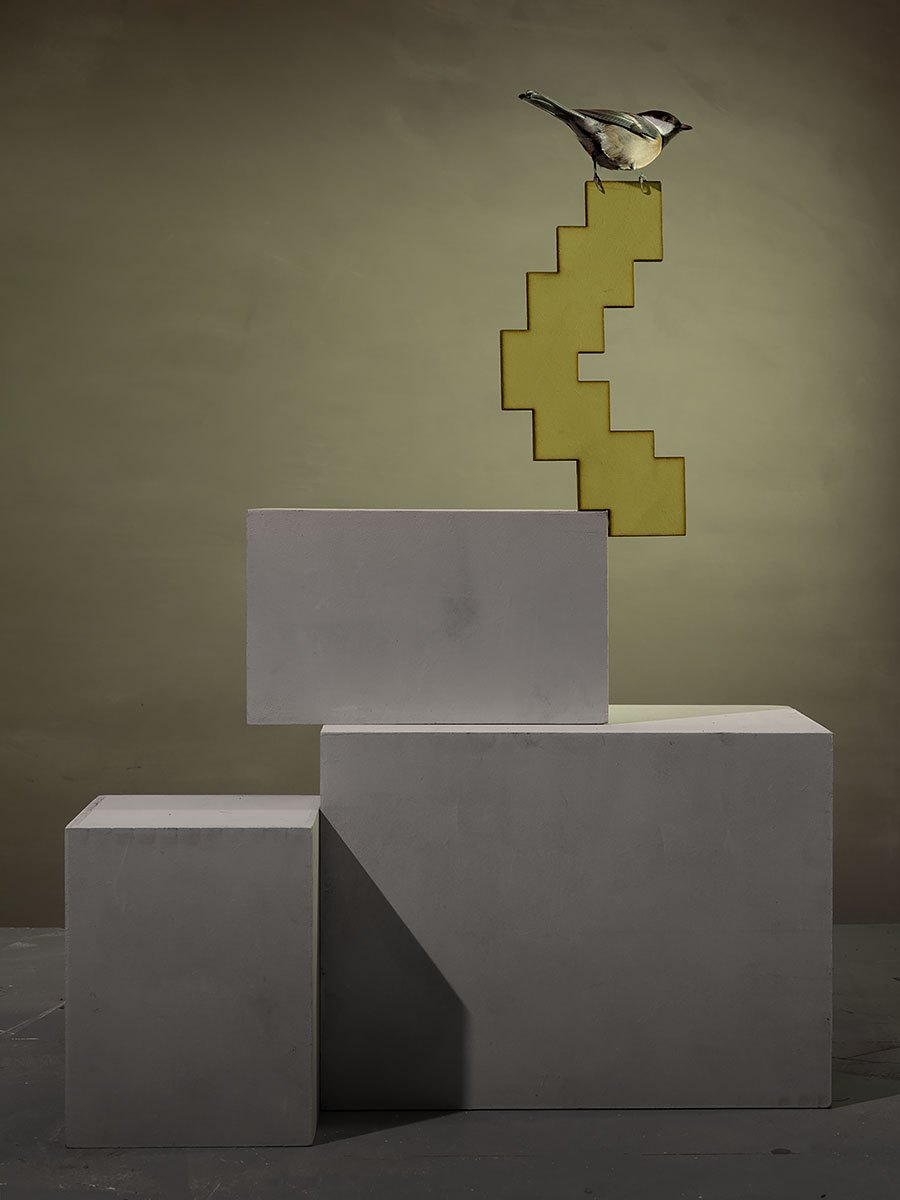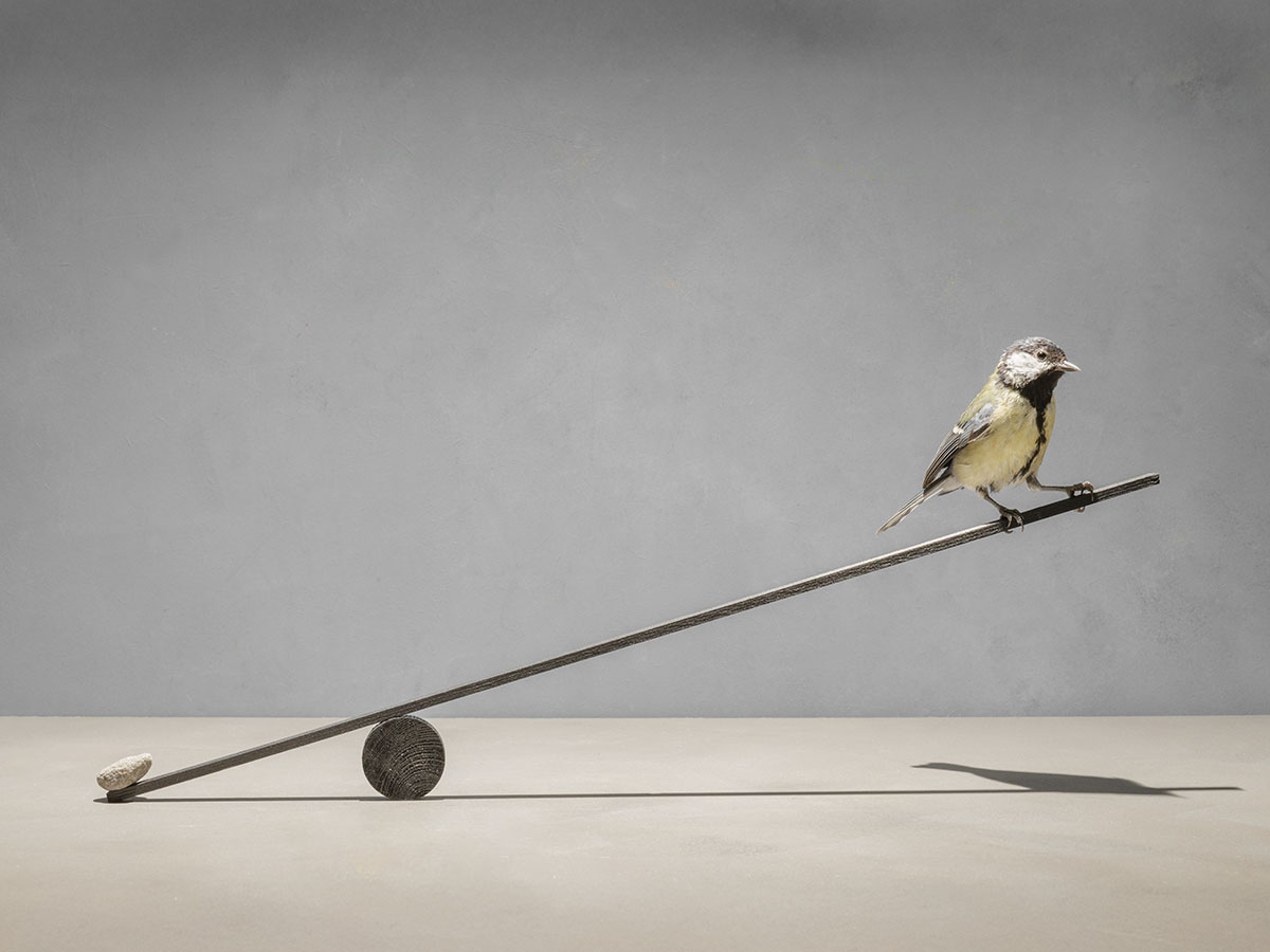 Down to Earth bestaat uit een reeks fotobeelden waarin een vogel telkens verschijnt als maatstaf voor schaal, stilte en gewicht. In mijn openluchtstudio in mijn achtertuin worden alledaagse objecten tot decor: niet om een verhaal te illustreren, maar om de logica van kijken licht te laten kantelen. De humor blijft droog en onopvallend — meer een verschuiving dan een punchline — zodat het beeld eerst als vorm en daarna als idee gelezen wordt. Door herhaling, negatieve ruimte en eenvoudige compositieregels ontstaat een ritme van spanning en adem. Wat overblijft is een aards soort poëzie: de vogel als klein anker in een wereld die net niet klopt.