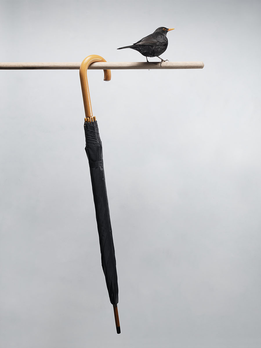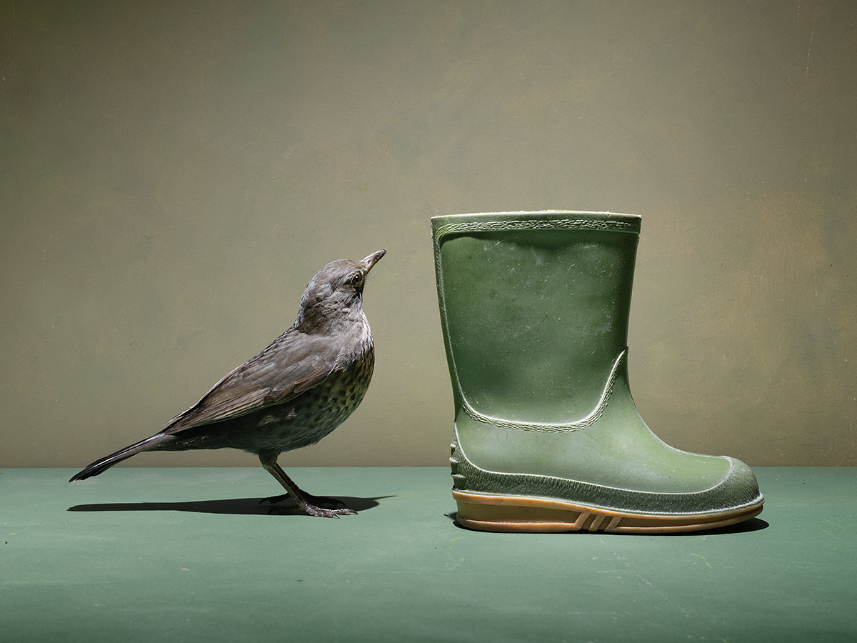 Down to Earth is een reeks geconstrueerde beelden waarin een vogel telkens verschijnt als maatstaf voor schaal, stilte en gewicht. In een gecontroleerde, minimale ruimte worden alledaagse objecten tot decor: niet om een verhaal te illustreren, maar om de logica van kijken licht te laten kantelen. De humor blijft droog en onopvallend — meer een verschuiving dan een punchline — zodat het beeld eerst als vorm en daarna als idee gelezen wordt. Door herhaling, negatieve ruimte en eenvoudige compositieregels ontstaat een ritme van spanning en adem. Wat overblijft is een aards soort poëzie: de vogel als klein anker in een wereld die net niet klopt.