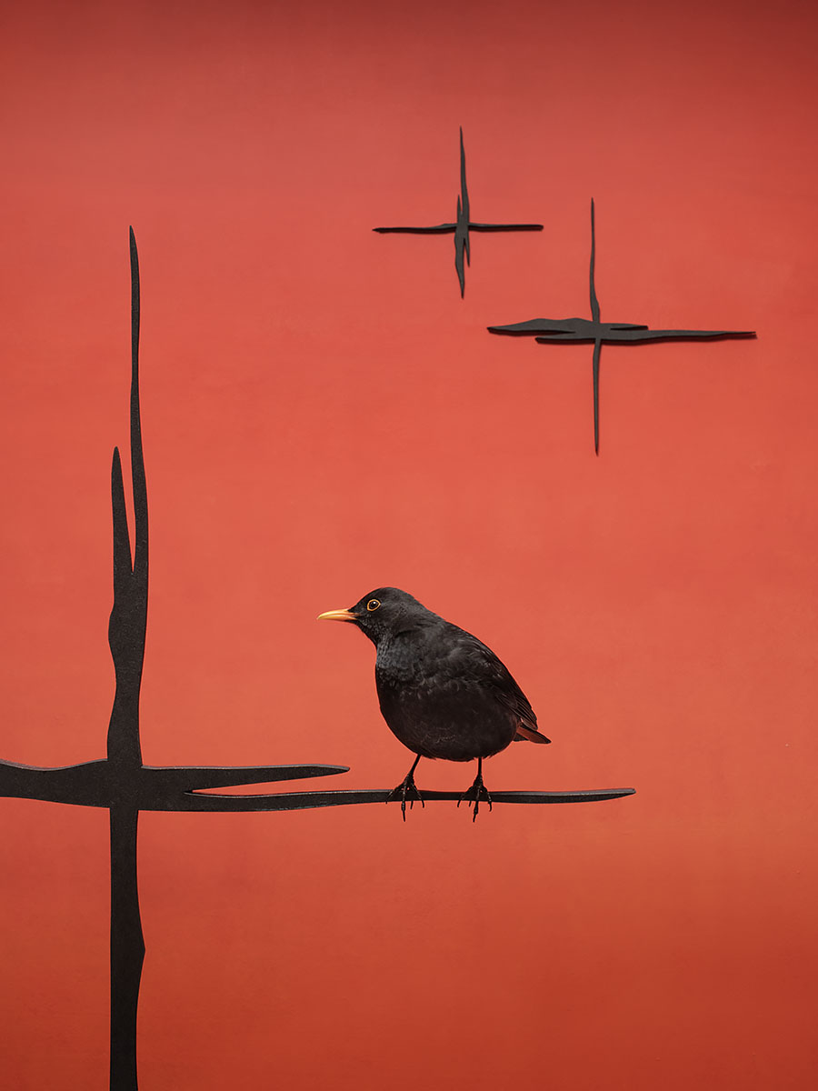 In mijn meest recente serie ligt de focus op de zwarte vogel. Gedurende de acht jaar dat ik vogels fotografeer in mijn achtertuin zijn de merels en de kraaien nog niet echt aan de beurt geweest. Ze zijn moeilijk te lokken naar de opstellingen. Heel af en toe lukte het om een merel in mijn opstellingen te krijgen. Maar vanaf december 2025 is er een merel die blijft maar komen. Het mannetje is opvallend zwart. Het is een fluweelachtig zwart dat soms neigt naar het absolute zwart. De titel Variations on a Black Bird is een hommage aan het zwart, de merel en hopelijk ooit een kraai.